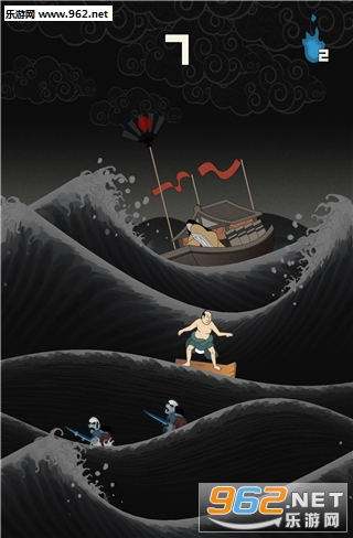 1.玩家可以通过左右滑动画面来移动自己的角色。请玩家利用波浪高高跳起。一旦成功踏上浪尖,玩家就能得分。