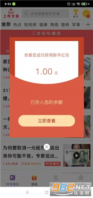 1、新用户下载注册财气赚app就送1元,转发文章被阅读单价1.6元/次,支持上传文章