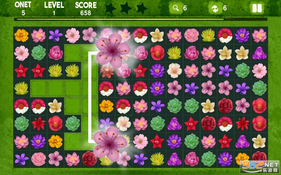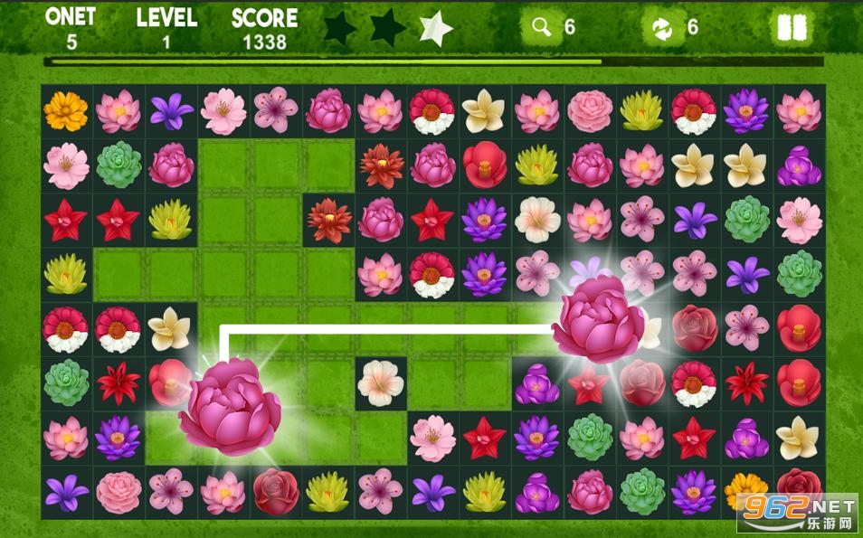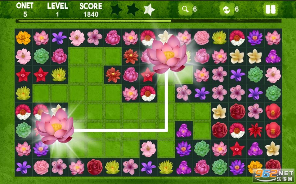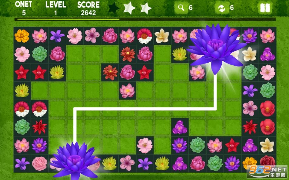 -发现开花花园的秘密,移除2种相同的onet花,它们可以在3条线内连接以达到目标分数!