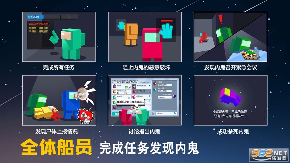 在这款游戏里,你可以扮演宇航员或者内鬼两种身份。作为一名宇航员要维护太空基地的安全,完成各种任务,躲避破坏者的伤害,保护太空基地。