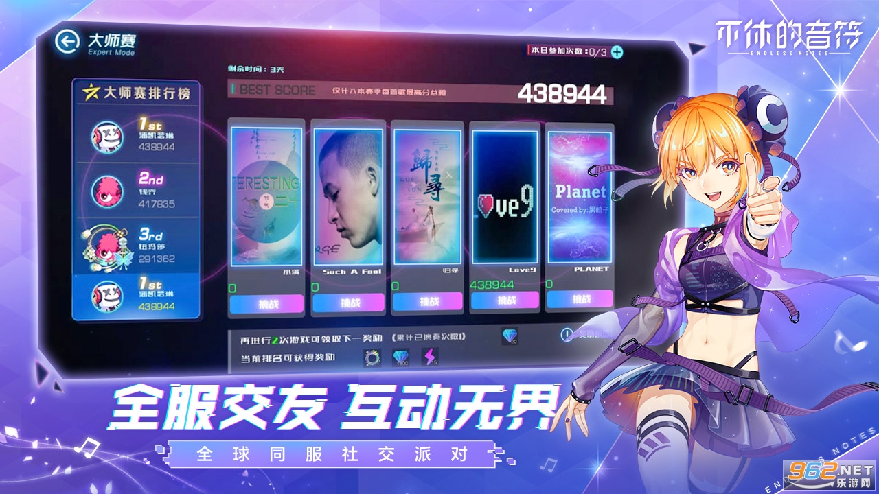 《不休的音符游戏》是一款画面清新的音乐节奏手游,游戏加入了众多热门的歌曲,可以选择自己喜欢的音乐进行挑战,敏捷的点击下落的音符,演奏美妙的音乐,完成度越高最后的得分越高,游戏有着剧情副本可以挑战,也可以和好友一起组队去竞技冒险。