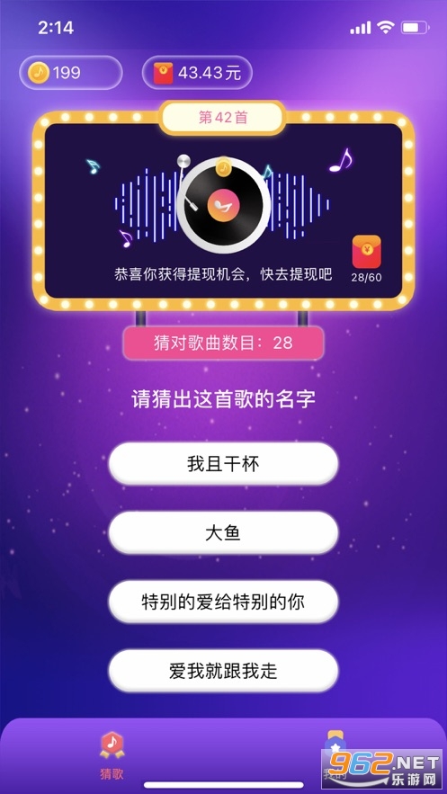 《人人猜歌app领红包》是一款可以通过猜歌赚钱的游戏,大家在这款人人猜歌app中可以享受到好玩趣味的猜歌游戏,同时通过猜歌来赚海量的红包奖励,300元提现不同与市场上的其他红包软件,金额大,值得大家入手一试!