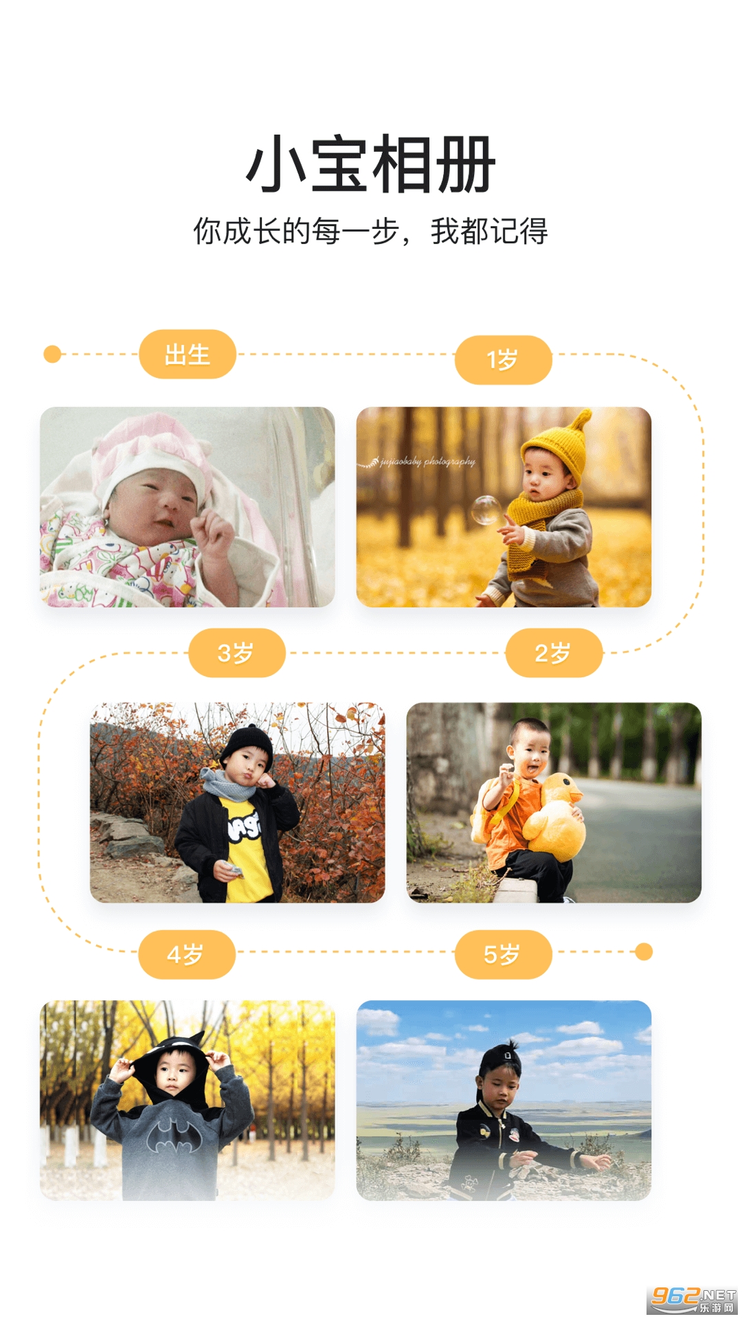 1.从宝宝学会爬行、到学会走路,到上幼儿园,到上学...成长过程中的日常生活,或出游,或身高体重数据等,都可以记录到宝宝的相册里。