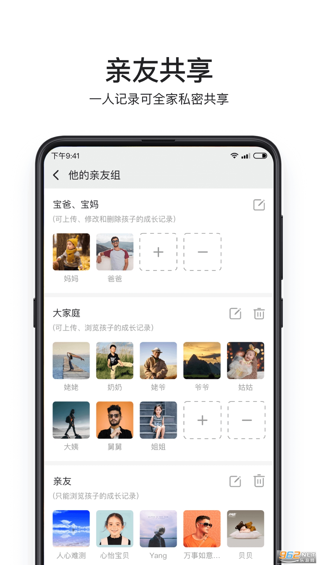 4.宝宝的家人、亲友都可以共同维护宝宝的相册,上传、编辑、浏览,宝爸宝妈可以设置各个亲友的操作权限。