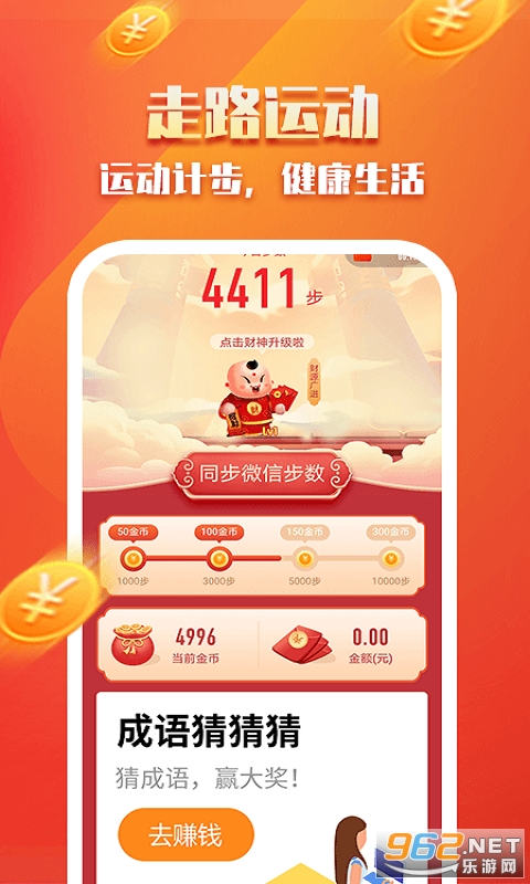 开心迎财神是一款玩转娱乐游戏还能获得财富的应用,开心迎财神游戏里不仅运动可以赚钱,还能通过合成财神爷、猜成语来赚钱,开心迎财神趣味十足奖励多多。