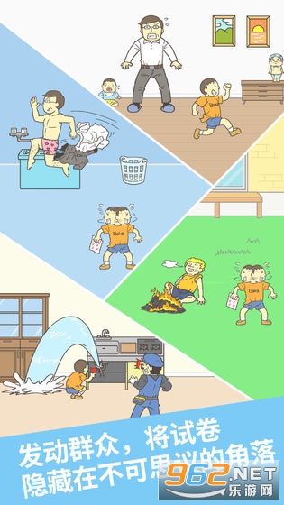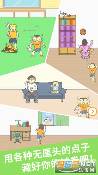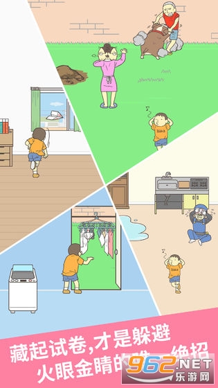 这款游戏中可爱调皮的孩子将和自己的父母玩起捉迷藏的游戏,因为自己考试得了零蛋,不想被自己的父母揍,就将自己考试得了0分的考试卷全部隐藏起来,我们要做就是不要被他的父母找到试卷。