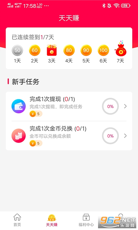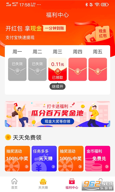 3、坚持每天签到,可以领取到现金红包,额度随机发放,累积更多可提现;