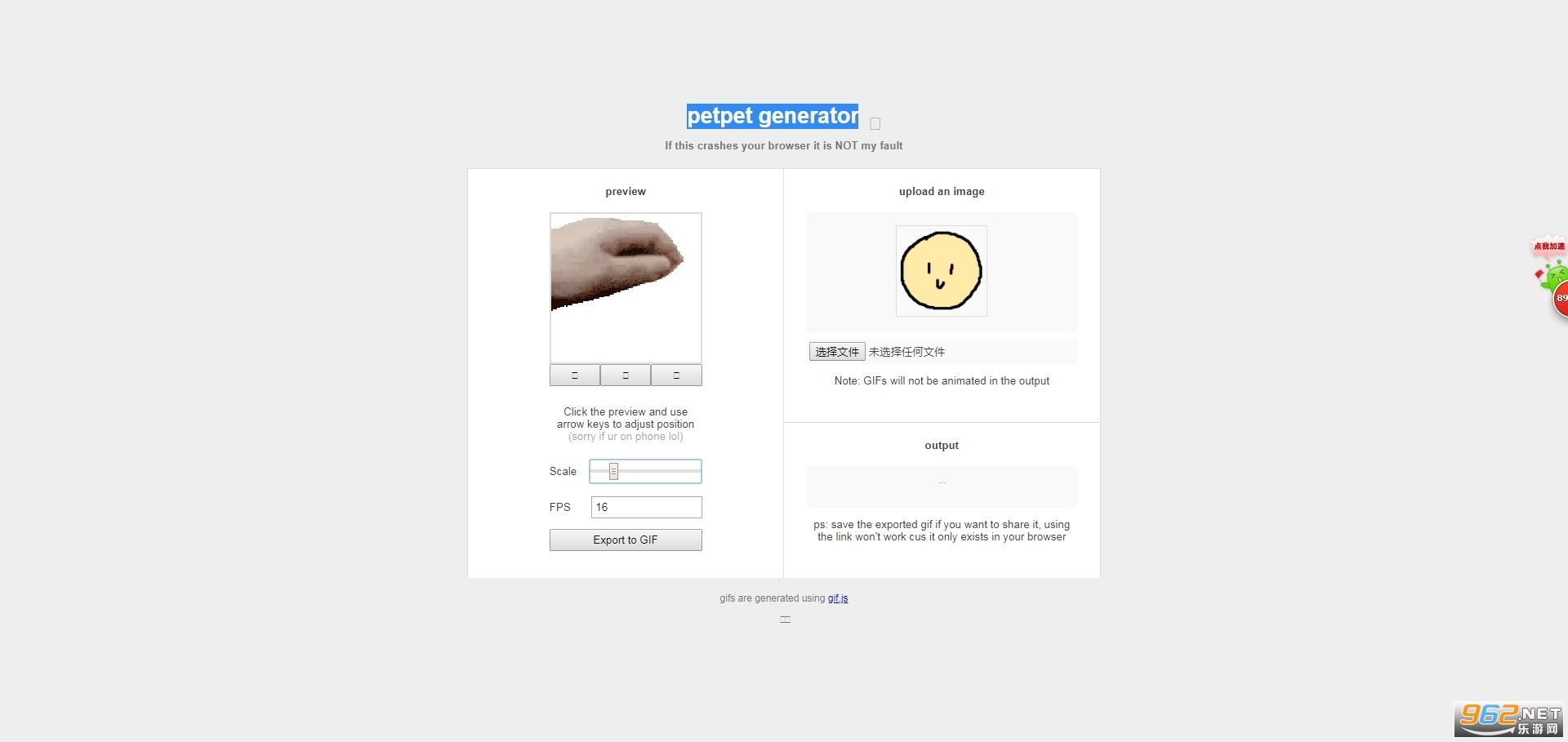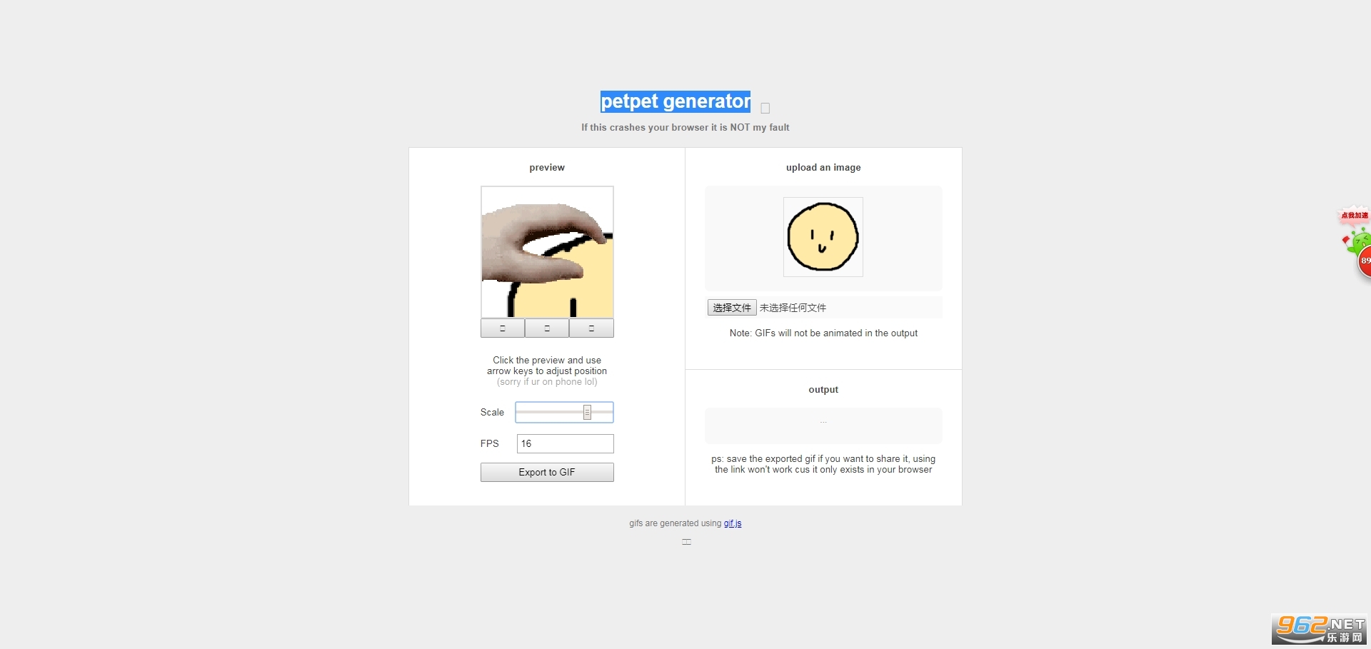 petpet generator网站是一款非常魔性的休闲类游戏软件。大家在这里面可以自己制作有趣的动态表情,只要你好好的体验,玩法上倒是没有什么复杂的地方。任何一张图片都是可以使用上的,大家可以随意的体验,而且整个过程会让你非常的喜欢。