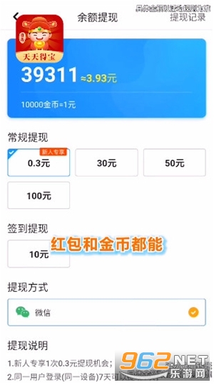 不错的赚钱软件,天天得宝平台有着众多的福利可以享用,每天整点抢红包,多抢多得,还可以通过签到做任务等来赚取金币,兑换现金红包进行提现,有需要的朋友可以下载试试。