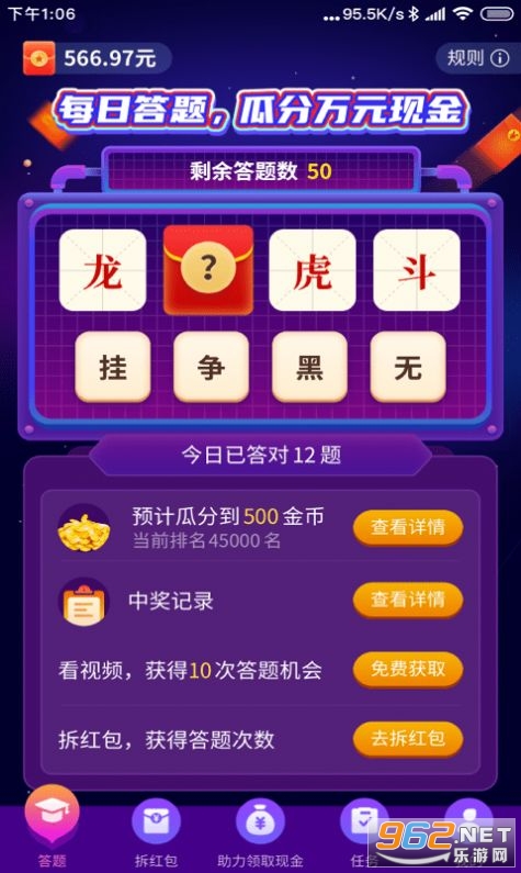 《疯狂拆拆拆领红包》是一款答题就能赚钱红包游戏,用你的脑力来闯关,让你的知识变现,答对题目就能获得红包奖励,答对的题目越多,获得的红包奖励就越多,每天利用空闲时间玩一玩,轻松赚到零花钱。