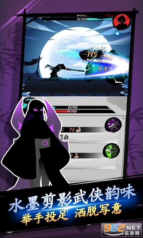 1、意味十足的水墨画绘画风格,以剪影方式出现的人物英雄,纯正的武侠题材设置,沉浸式的热血江湖故事,一场精彩纷呈的江湖冒险