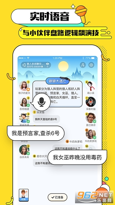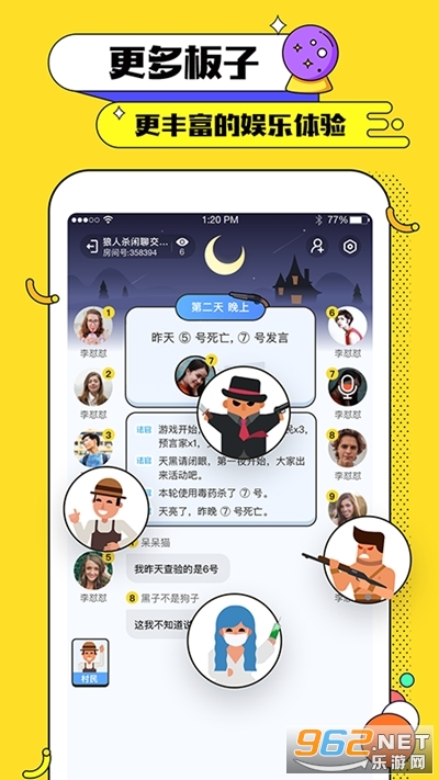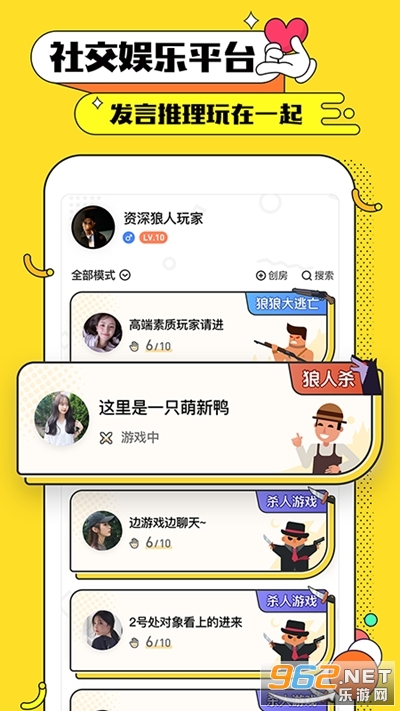 在这里,你可以体验“狼人杀”、“杀人游戏”等经典发言游戏玩法,帮你忘却生活中的种种烦闷和忧虑;你能同天南海北的小伙伴们玩在一起,边娱乐边交友,结识更多有趣的灵魂。
