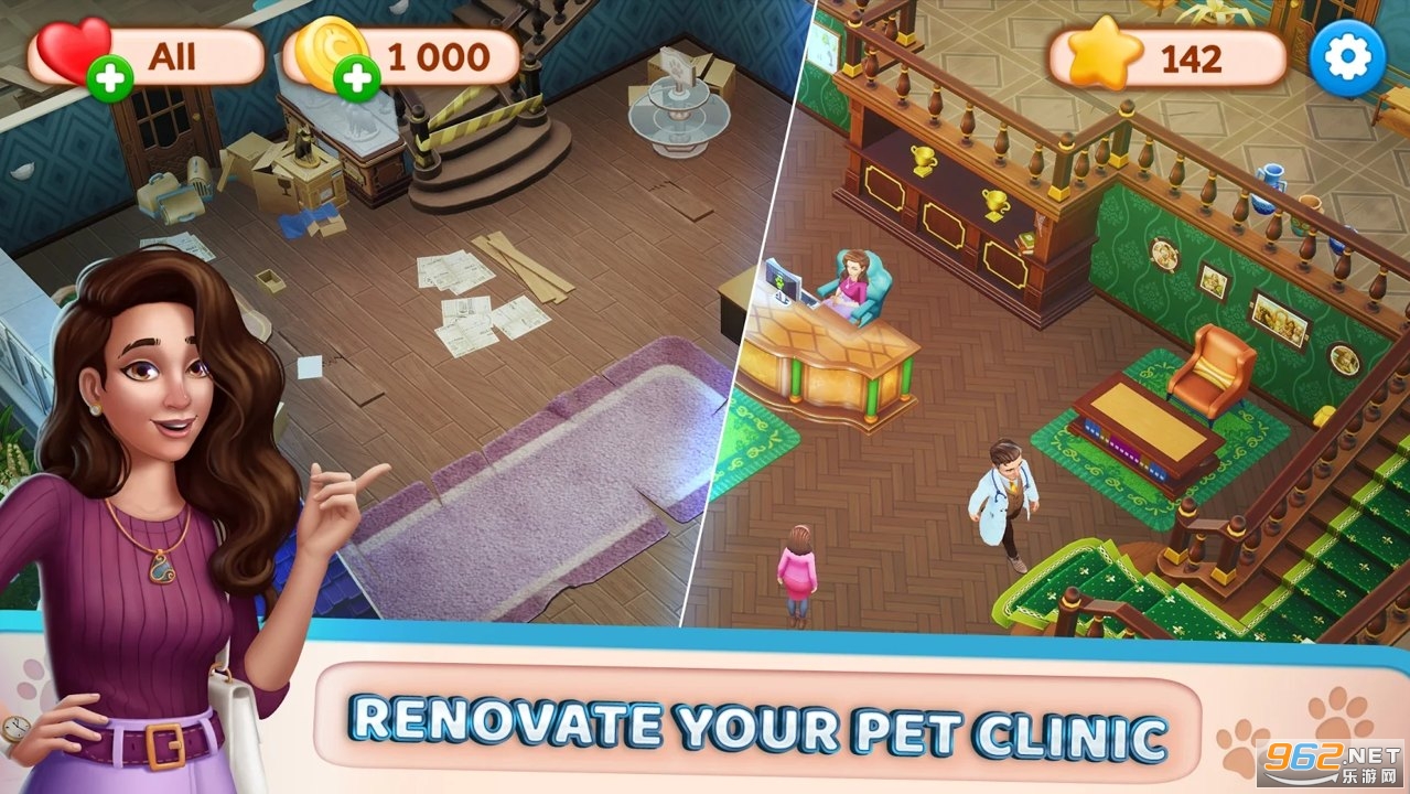 修复并装饰一所旧房子,将其变成拥有许多令人兴奋的房间的现代兽医医院,饲养可爱的宠物。玩有趣的三消关卡,并展开故事。