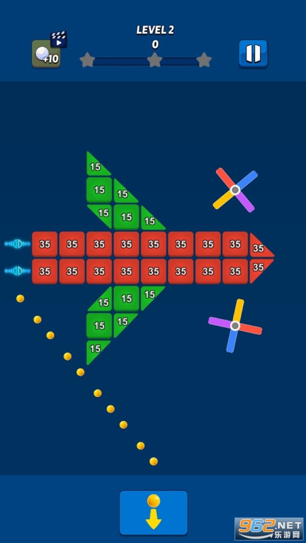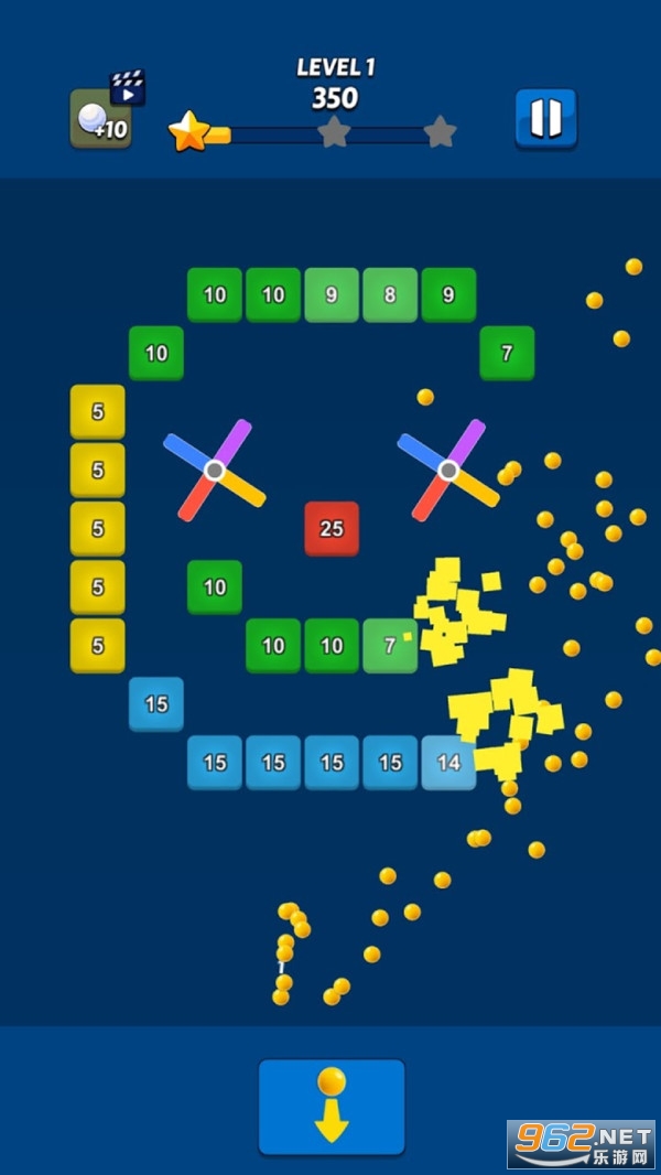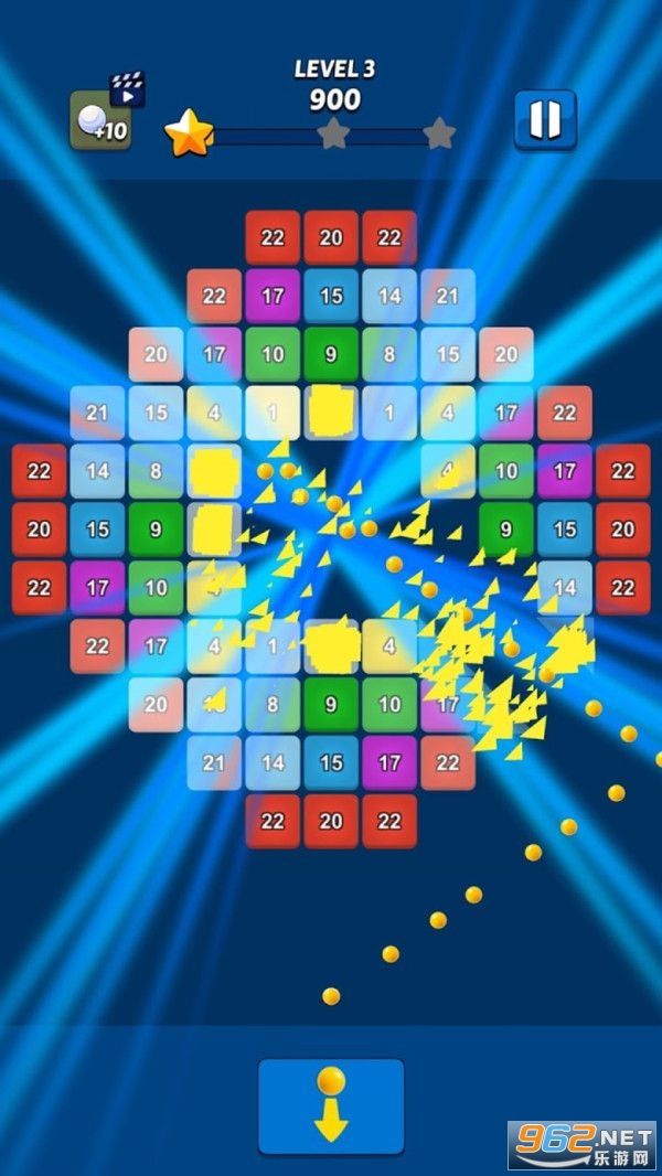 2、在射击中尽可能多地击碎砖块以收集3颗星,完美的完成将释放出更强大的子弹。