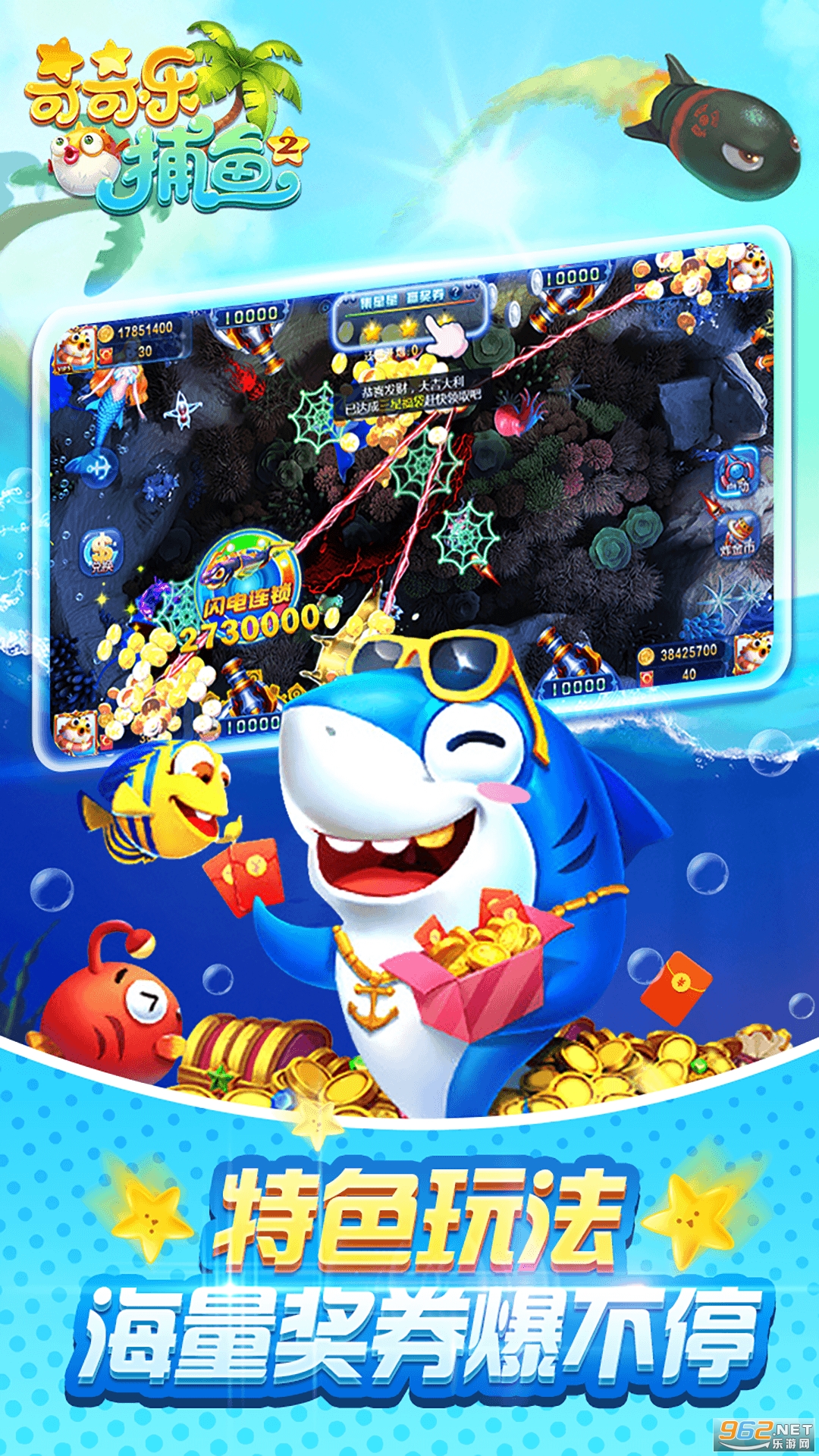 2.进入游戏后,架好不同等级的游戏炮舰、运用不同威力的射击炮,击获不同币值的鱼掉落可获金币鱼券奖励,每日领取在线礼包,瞄准随时出现的海底宝箱,惊喜更多!