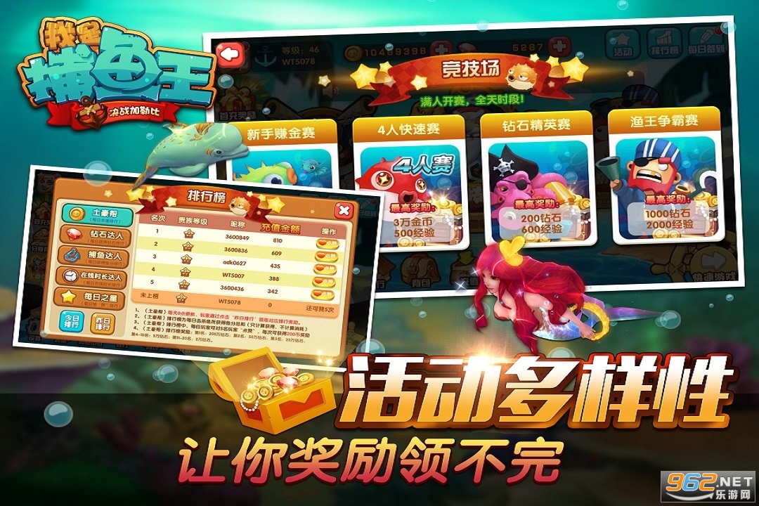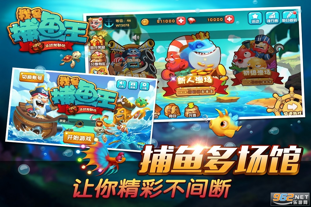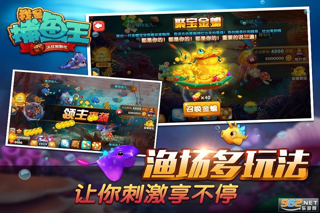 丰富玩法,章鱼BOSS,食人鱼BOSS,花样鱼阵变换,万倍BOSS来袭,多种休闲社交玩法满足同屏爆金体验。