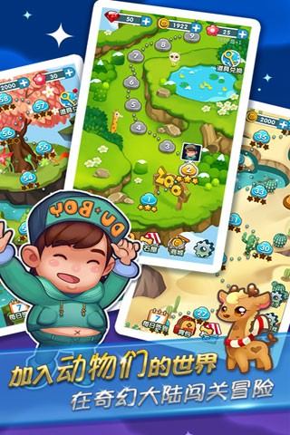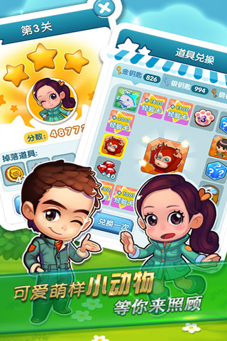 人与动物互动的三消类手机游戏,游戏富有挑战性的闯关地图、可爱超萌的游戏画面、炫酷趣味的特效和独特的策略消除玩法。
