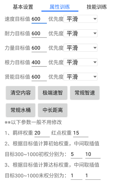 d)有一些角色有短期目标,必须保证某一项属性在前期达标,此时可以将优先度改为注重前期,这样就可以将其前期权重提升,以达到优先训练的目的。