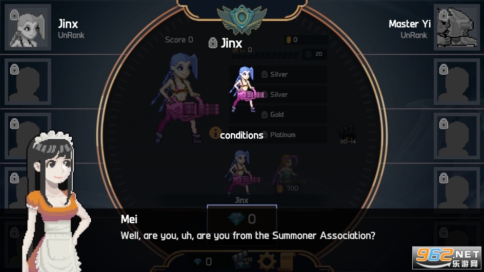 《LoLSlug(像素联盟最新版)》是一款模仿英雄联盟的游戏。采用了像素横版的画风设计,以闯关作为主要的玩法,让大家在游戏中选择自己知道的英雄联盟角色,进入到地图之中打怪杀敌闯关,一路释放各种技能,组合技,不断地解锁英雄去挑战!