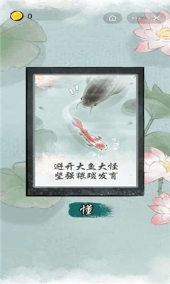 1、纯正的国风画面,鱼塘里有各种不同的生物,你要操控着蝌蚪不断的吞噬。