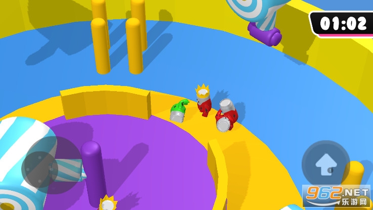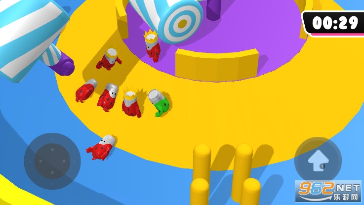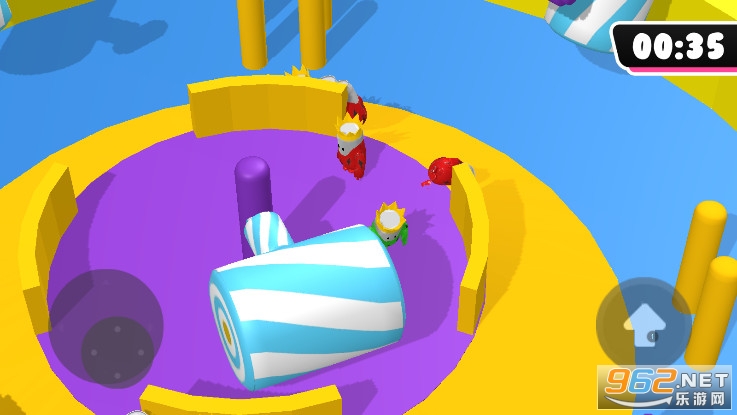 3:虚拟摇杆控制走位,游戏竞速闯关的玩法类似糖豆人冲关,画面感有趣。摇杆搭配向上跳跃的按钮灵活控制角色,有时候可以踩着其他玩家前进。