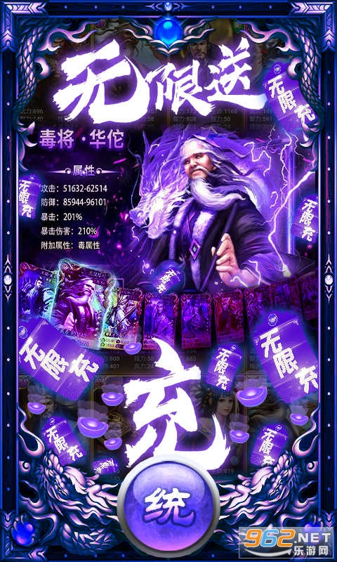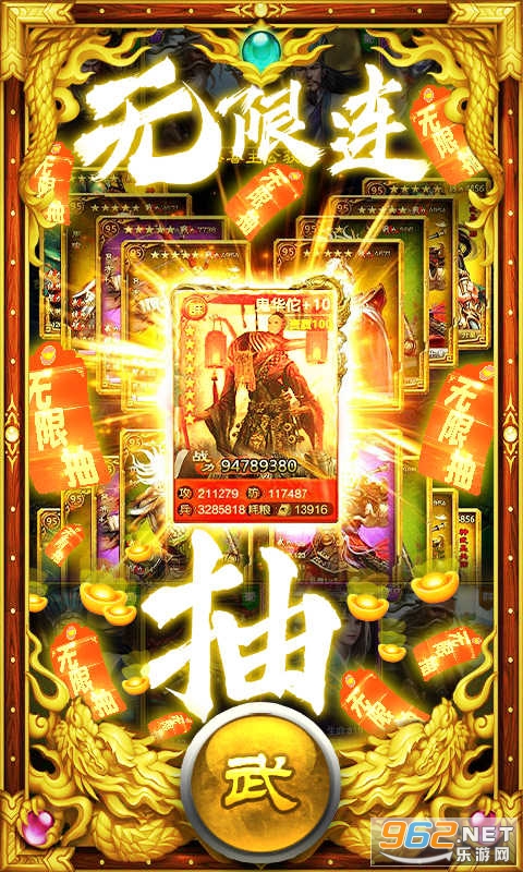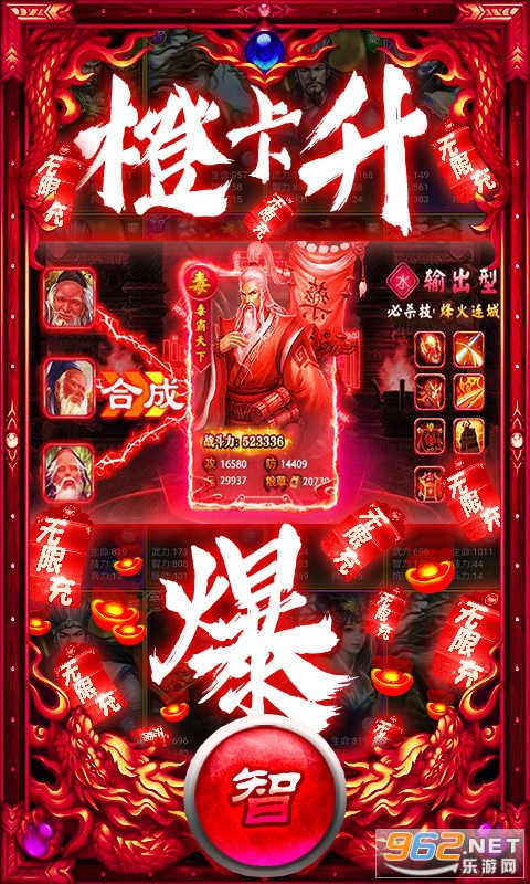 ★无限送充抽说明:①通关1-8开启在线奖励领取功能,持续领取30分钟可领完全部档位,内含大量高级招募券、超级招募券、充值卡、等大量道具。领完每天免费高级连抽,必得橙将。橙将可升红,轻松游戏不花钱!