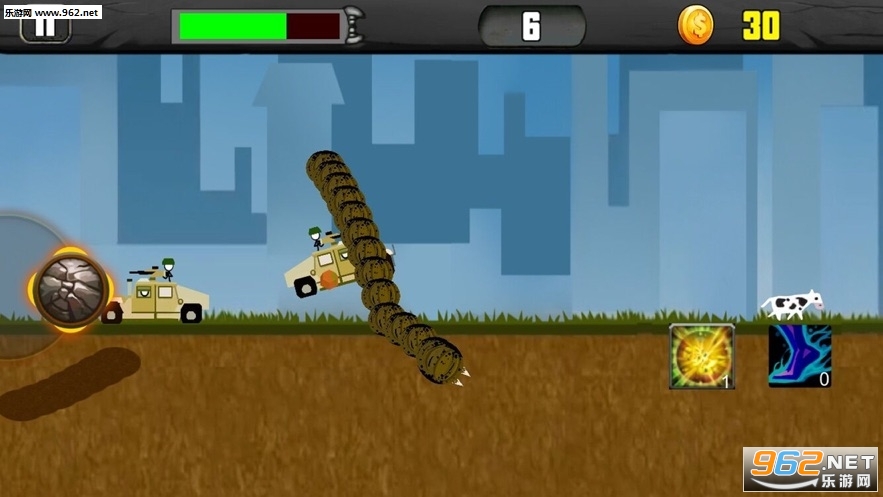怪物破坏城市:玩家在游戏中变身成为一条可怕的蠕虫,你要做的就是用最快的速度破坏整个城市,从地下发动突然攻击,用最快的速度冲出地面摧毁建筑,在你搞破坏的同时,人类的战机、坦克等等也会随时准备消灭你哦!