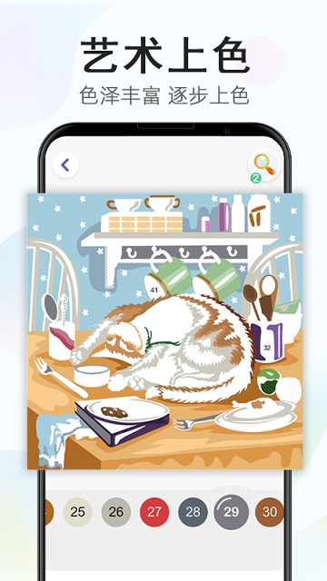 ·没有复杂的功能以及使用方法,只需要轻轻点击图片中需要上色的部分,慢慢复现一张色泽丰富的作品。
