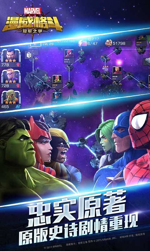 漫威正版授权,游戏全面收录漫威漫画及电影中出现的热门角色,力求满足超级英雄的粉丝们的收集需求。目前游戏中包括来自“复仇者”中的美国队长、钢铁侠、绿巨人浩克和鹰眼,“X战警”中的金刚狼和暴风女以及来自“银河护卫队”中的星爵、火箭浣熊和卡魔拉等众多具有代表性的大牌明星。随着《蚁人》等电影的上映,还将陆续加入更多玩家喜爱的重量级角色。而在反派方面,万磁王和奥创的登场让原本顶级的阵容变的更加震撼且潜力无穷!