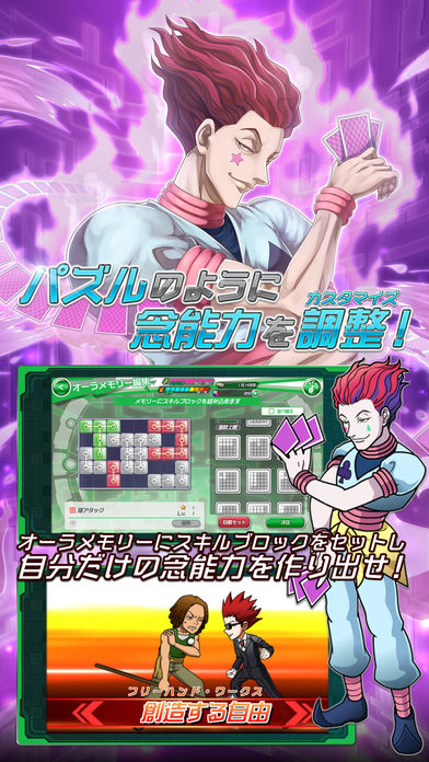 3、以电脑模拟的猎人世界为舞台,玩家创造自己的虚拟角色在模拟的世界中和熟悉的角色们一起进行大冒险,将提高念能力的「气记忆」(オーラメモリー)系统和消除玩法结合。