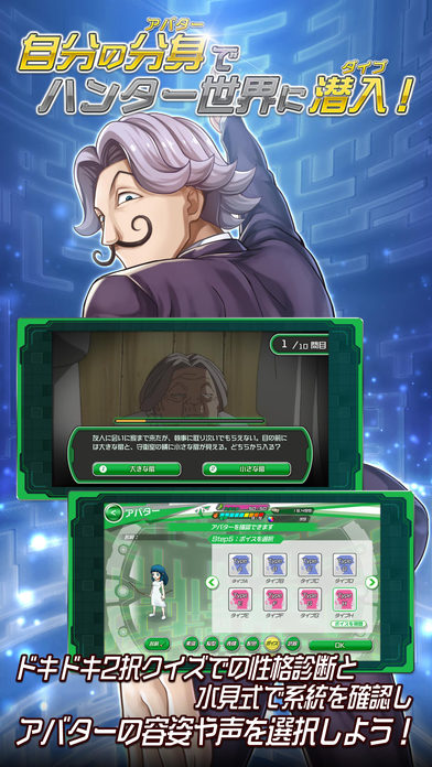 本作是改编自日本漫画家富坚义博绘制的漫画《全职猎人》的最新作手机游戏。以电脑模拟的《全职猎人》世界为舞台,玩家创造自己的虚拟角色在模拟的世界中和熟悉的角色们一起进行大冒险。游戏还将原作中的念能力诊断式水见式与问答游戏融合,将可以提高念能力的「气记忆」(オーラメモリー)系统和消除玩法结合。想体验体验猎人世界的玩家不要错过了。