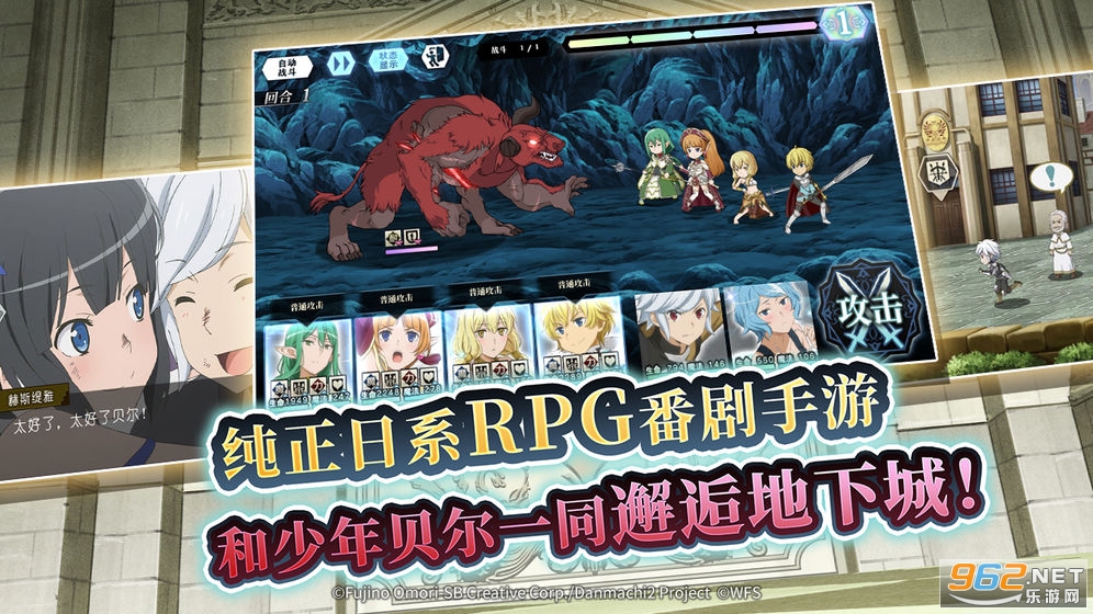 游戏本身继承了日式经典RPG的回合制玩法,包括迷宫探索、剧情任务、卡牌收集及角色养成。超百张精美人物立绘及礼装,自由组合随心搭配,组建属于自己的“眷族”小队!