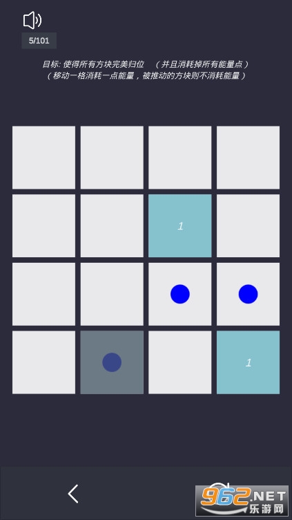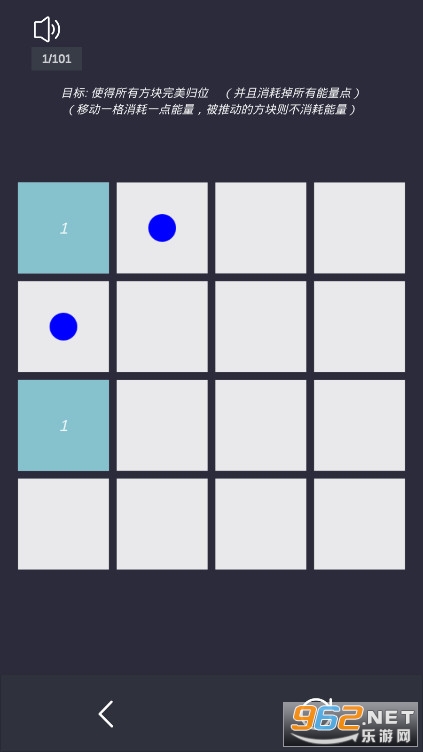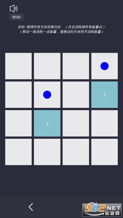 《方块归位小游戏》是一款非常有趣的休闲益智类游戏,玩家需要在四乘四的网格图中通过操控箱子来使他们回归到蓝色的光点上,游戏看似简单,但是玩家需要在狭小的空间移动盒子也不是一件容易的事情,随着游戏关卡的增加游戏难度也随着增加。感兴趣的玩家快来挑战吧。