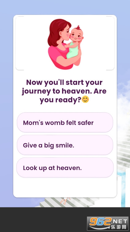 《天堂之旅安卓版》是一款模拟人生游戏,从一个小婴儿开始,在通往天堂的阶梯上不断攀爬,在这个过程中你会不断长大,经历你的一生,在你一生中你会面对很多选择,这些选择会影响你的后半生,最终你能否到达天堂呢?