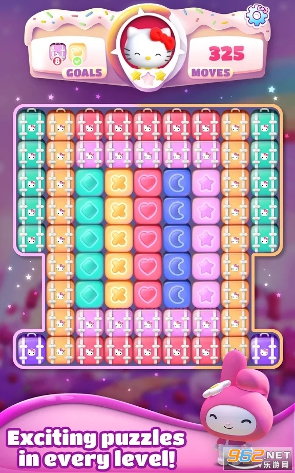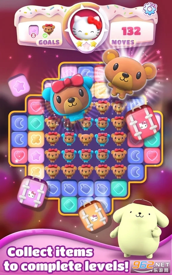 三丽鸥梦幻爆破游戏(Sanrio Dream Blast)是以凯蒂猫为主题设计而成的消除游戏,玩法非常的简单,每一关都会有不同的设计,你需要想办法将同样图案的三个色块相连接,在有限的时间内得到足够的分数即可通关,商店里可以购买到各种道具来帮助你,还有很多可爱的卡通角色,喜欢的话就来试试吧!