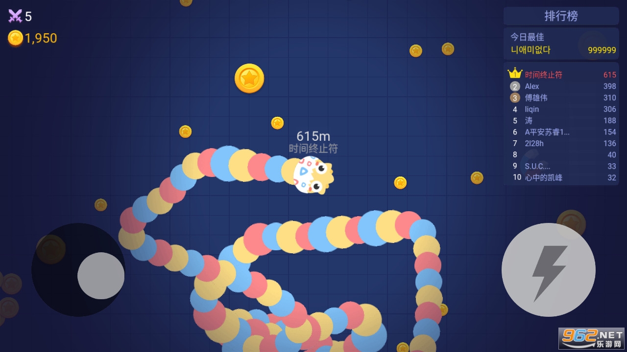 长按加速,用巧妙的走位让蛇身被别人撞上,就可以吃掉对方收集的金币迅速变长。