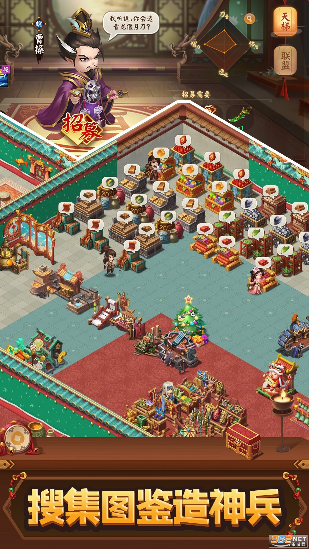 在这里,武将招募不靠武力,靠的是你制定“职业规划”,只要打造特定的装备与达到相应的声望就能招募武将啦,还有那些更稀有的三国武将就需要足够的“天梯积分”来解锁啦,有了武将之后,玩家不仅可以派遣TA探寻天下,寻觅那些奇珍异宝,还能与其它三国小伙伴来一场酣畅淋漓的天梯对战哦。