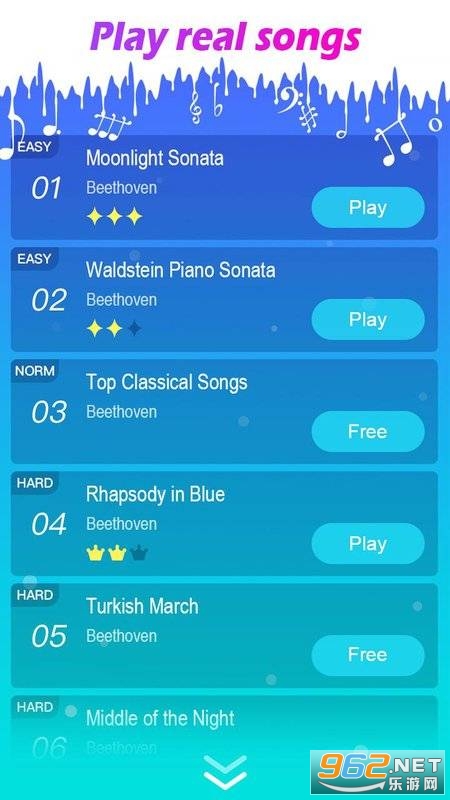 《梦幻钢琴块2最新版》是以钢琴音谱为原型设计的休闲节奏类游戏,玩家需要根据音乐的旋律去正确的敲打钢琴键,玩法上简单有趣但极富节奏感,关卡设计多样化也有很多的音乐曲目自由选择,挑战最佳钢琴师。