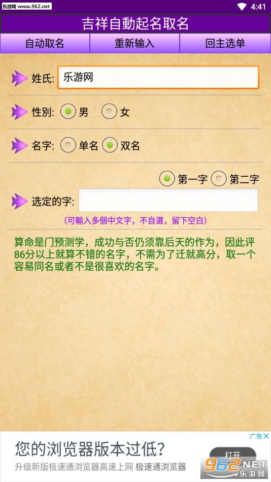 吉祥起名是一款非常实用的起名软件。一般情况下名字将会伴随着一个人的一生,所以起一个好名字非常的重要。《吉祥起名》就是这样一款专业起名软件,结合生辰八字,风水玄学,为你起一个最好的名字。