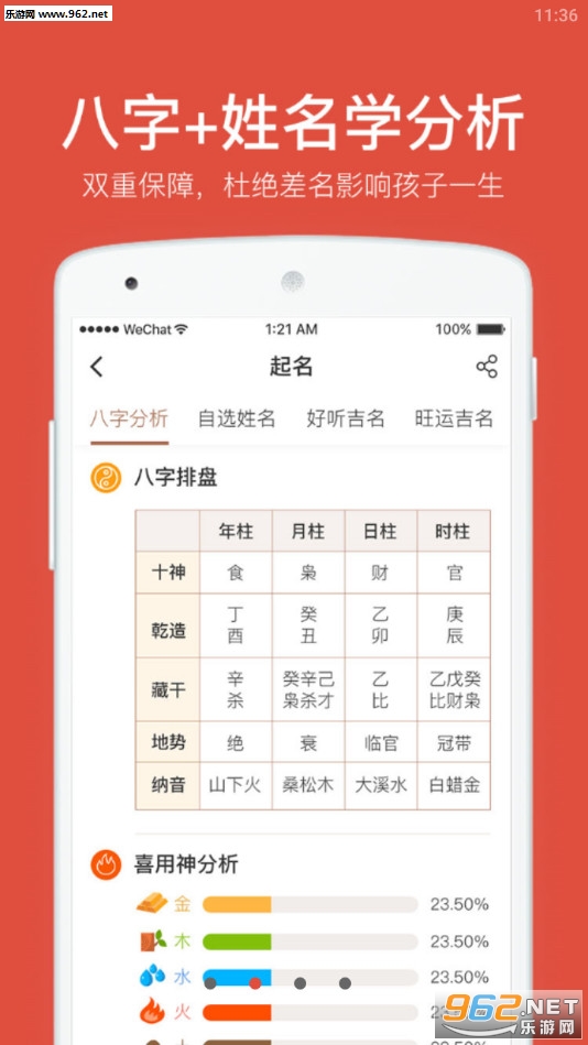 3.【专业起名】:根据真太阳时,舍弃三才五格,首次提出河洛数理法,提前预知姓名对宝宝后天的影响;结合八字五行,周易八卦,汉字释义,诗词寓意,音律音调,字音字形等,让起名不再是一件麻烦事
