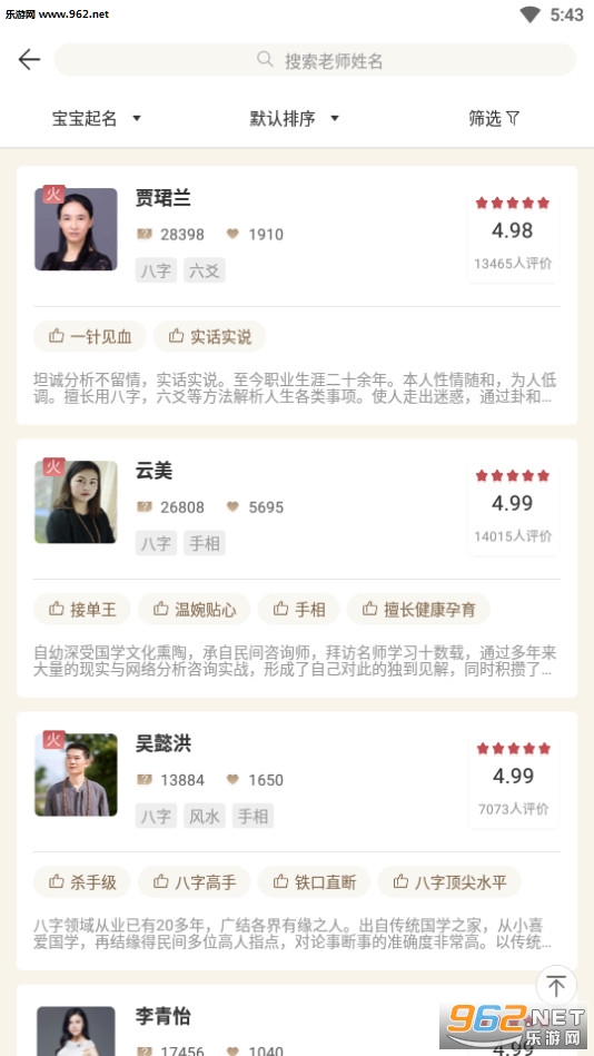 大师起名取名是一款非常实用的帮助家长起名的软件,汇集了由多名研究专家精心打造的,总共有自助起名和真人老师起名两种模式,利用你的生辰八字结合易经命理,帮助你起一个对你一生都有重要影响的名字。一个好的姓名预示了一个人的未来,影响了一个人的机遇,利用先天八字的不足,用名字弥补这一缺陷。