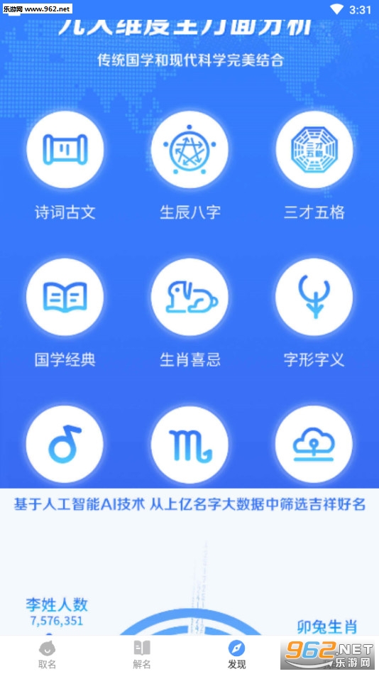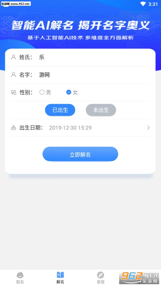2、一键智能起名解名,八字排盘,分析名字数理,方便快捷挑选高分吉名。