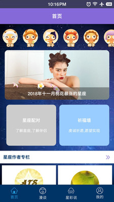 【首页】含有星座运势,星座资讯,星座专栏分析等,让用户更多的了解星座,同时还有祈愿墙功能,让用户能够祈福,许愿。