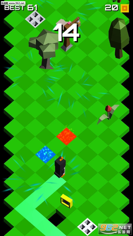 敏捷跳跃冒险游戏,可以利用金币解锁其他角色体验,玩家需要敏捷的点击屏幕控制角色转变方向,躲避地图中出现的钉刺、火、水等危险。