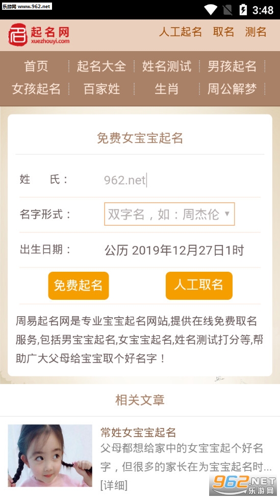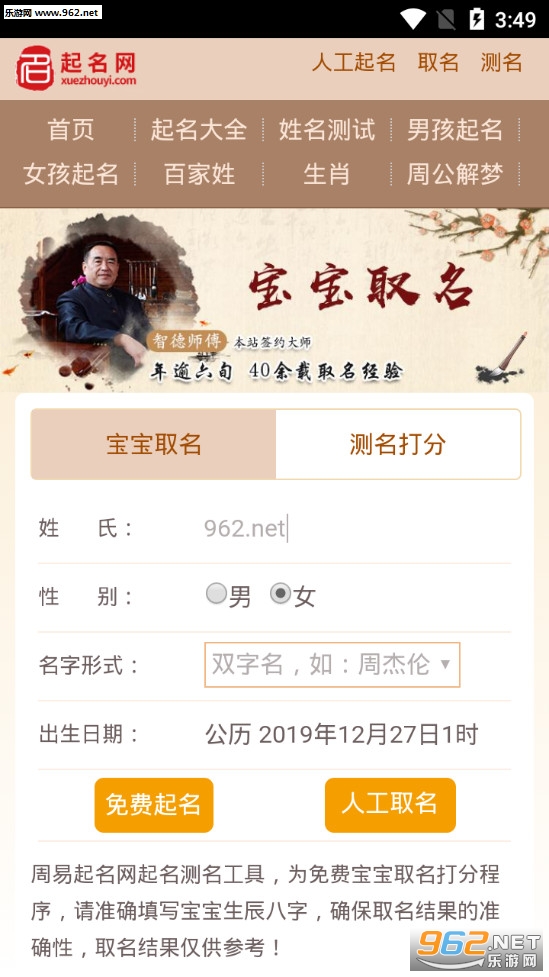 1点击起名,输入姓氏,性别和出生日期时间,软件采用大数据技术为您自动起名。