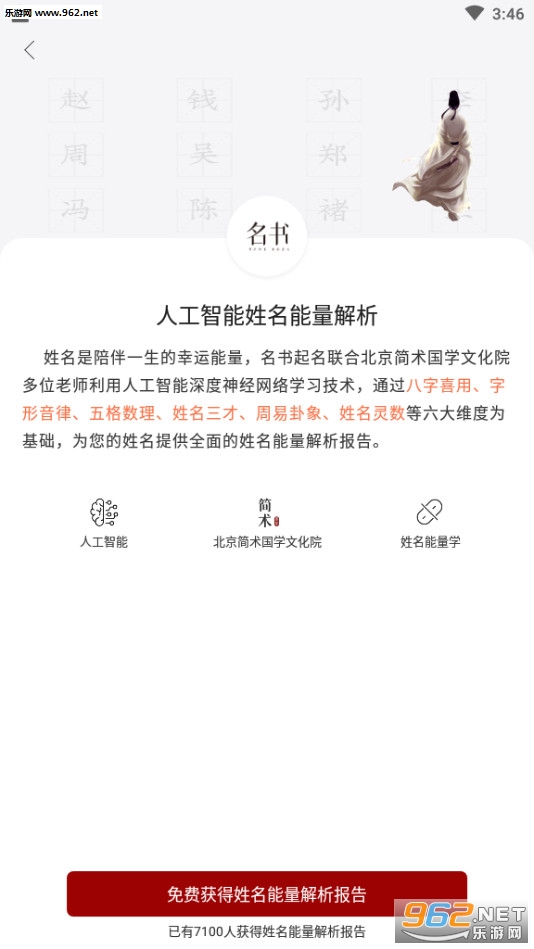 通过特有的智能解名算法,为您的姓名提供多维度分析,了解姓名拥有的能量助力。