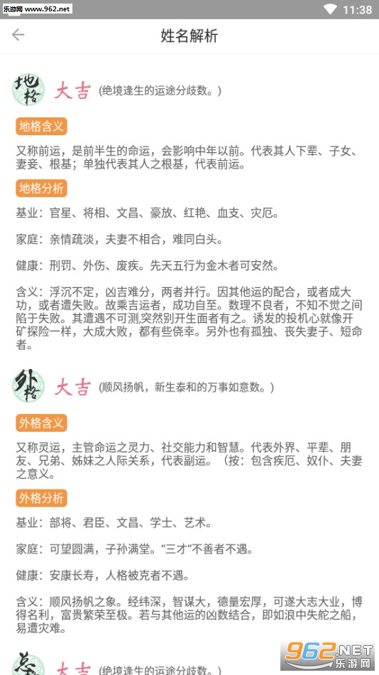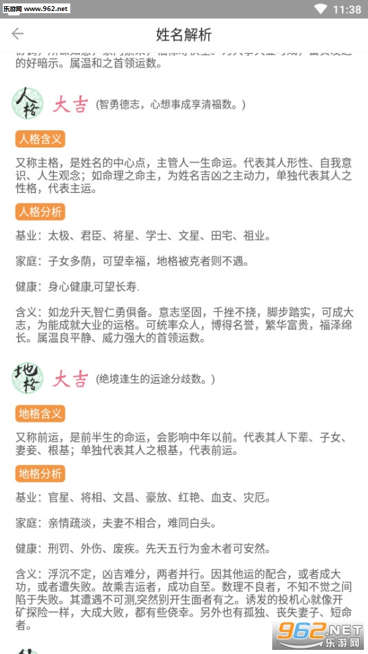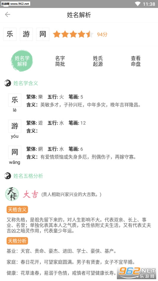 2.起名取名大全软件全面参考《易经》以及近百种中国古代命理解析古籍,五行分析、生辰八字测算、三才五格评分、起名喜用神全面按照传统的古代算法对应标准进行转换,为用户提供姓名解析。