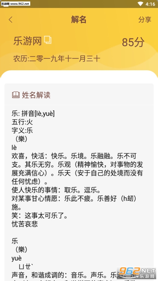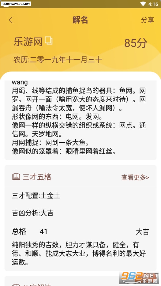【全方位解名】 名字打分,姓名打分,姓名详解、八字解析、五格三才解析、周易八卦解析、音调解析、字形结构解析,读懂名字背后的寓意全方位解析名字。起名取名大全软件结合易经命理,三才五格,以及古文诗词曲赋的文采帮您解析出名字的五行八字,命理命格。