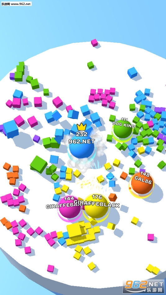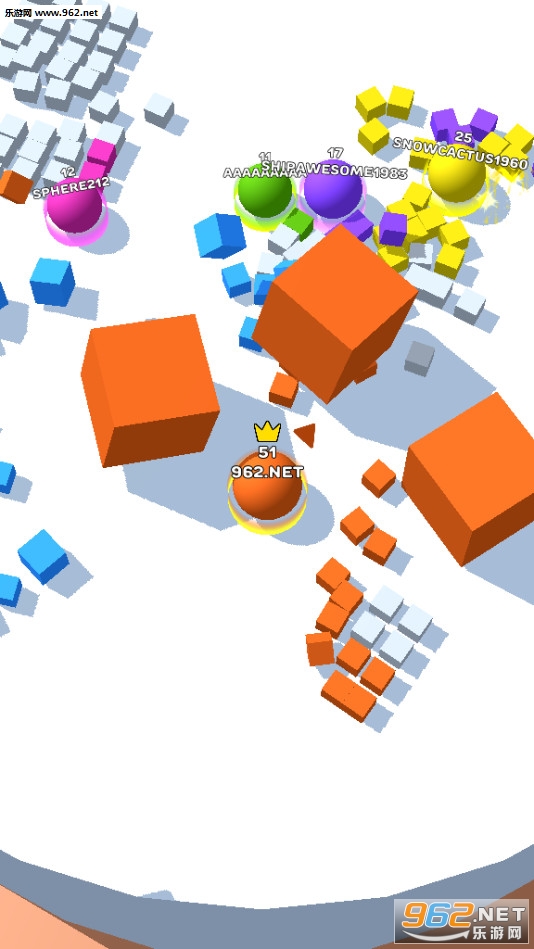 轻松io游戏学习,但很难掌握!将球拖到立方体上以变色并变大自己。在竞技场上击败其他敌人赢得胜利!最后一名生存者赢得比赛。