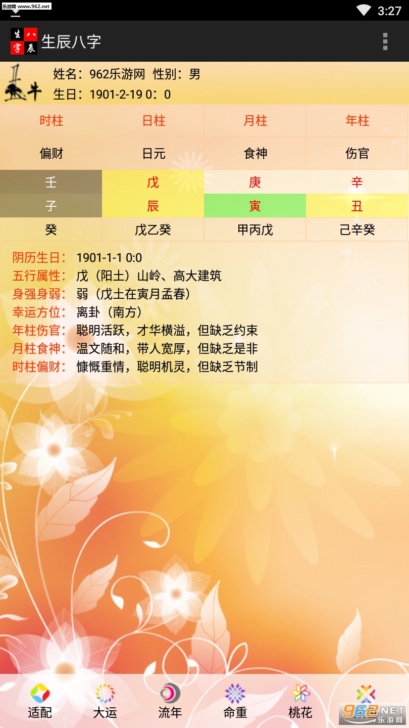 根据输入的阴历或者阳历生日,准确的算出您的生辰八字,年柱月柱日柱时柱,大运,命重,桃花,根据日柱天干,算十神流年